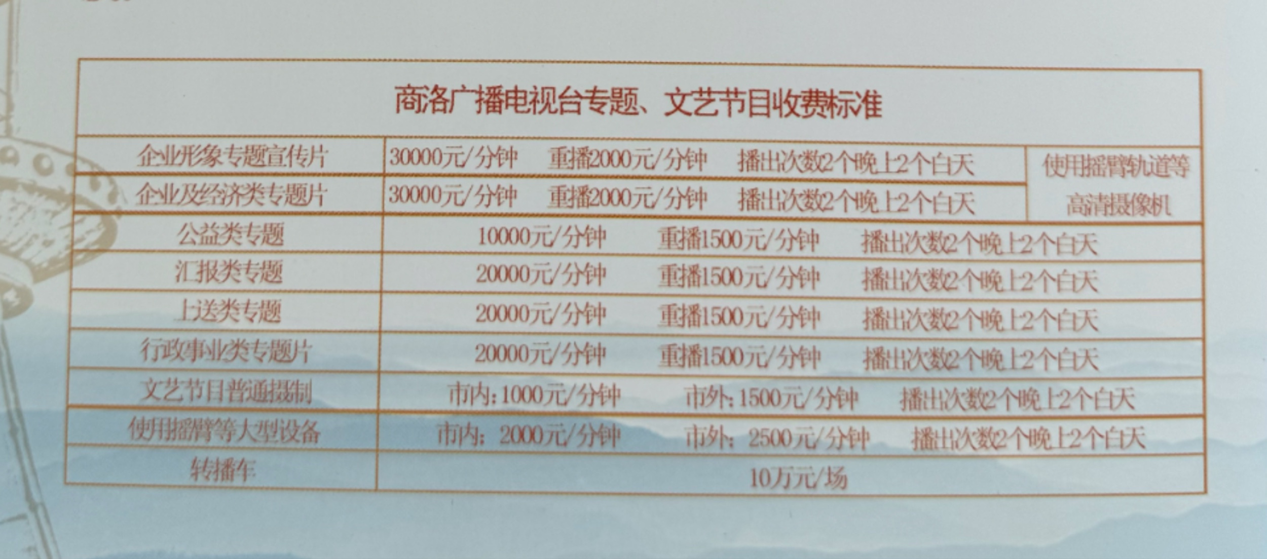 | 资源或服务单价 | 3万元/分钟,含摄制费和播出费 | 规格 | 部 |