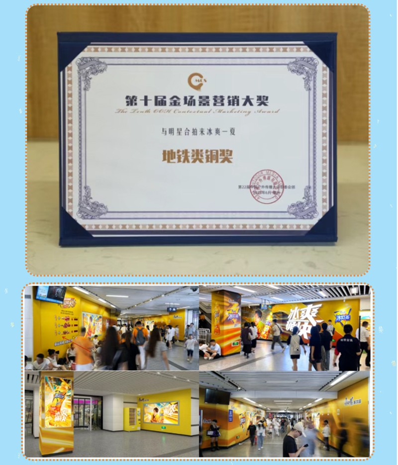 【与明星合拍来冰爽一下】案例及【 为“艾” 发声 与爱同行】案例,分别斩获第十届金场景营销【地铁类铜奖】、【地铁类优秀奖】两项荣誉。